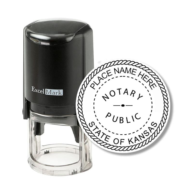 This Kansas notary stamp for professional notaries creates a high quality seal impression using a round self-inking notary stamp. A self-inking notary stamp mount re-inks the rubber die into the self-contained ink pad before each impression, making it ideal for quick, repetitive stamping during those busy work days. Your ExcelMark ink pad initially lasts for thousands of impressions and is simple to re-ink and replace. A clear base on the mount allows you to easily line up those impressions.